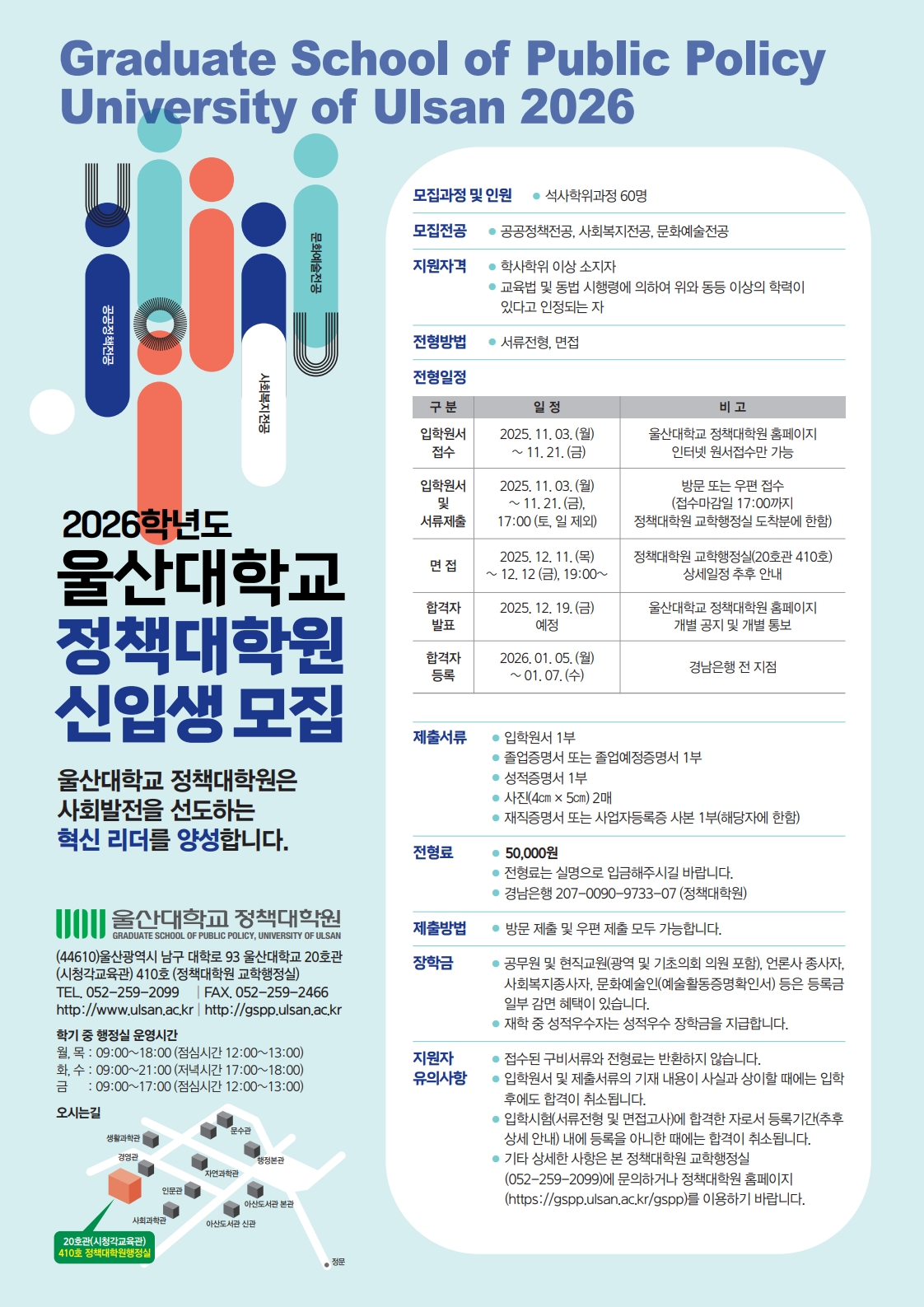 2026학년도 정책대학원 석사과정 신입생 모집 안내입니다. ▷ 모집 기간: 2025.11.3.(월) ~ 2025.11.21.(금) ▷ 모집 전공: 공공정책 / 사회복지 / 문화예술 ▷ 지원 방법: 온라인 원서접수 후 제출서류 방문 혹은 우편제출 (울산 남구 대학로 93 울산대학교 20호관 410호 정책대학원 교학행정실) 문의사항은 052-259-2099로 연락 바랍니다.